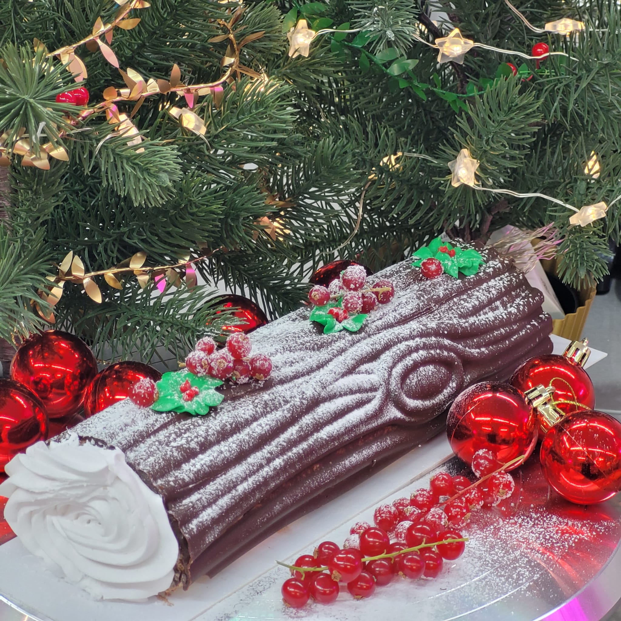 Cada tronco se prepara por encargo para garantizar la máxima frescura, y se entrega con decoración navideña y un acabado ligeramente espolvoreado con azúcar (sin gluten).